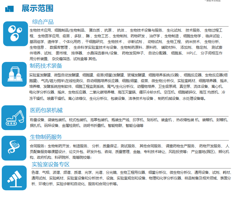1、生物制药成分:生物制药原料、原料药、酶、辅助材料、添加剂、稳定剂、测试套件等。
